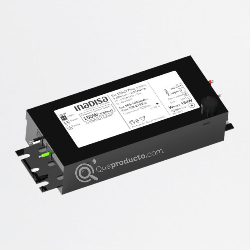 LED Driver DIM 150W, 500-1050mA, Output 108-215 Vdc, Input 120-277 Vac, IP66, Aislamieno clase I, Carcasa Metálica, Dimerizable 0-10 ó resistor, Ref DE1050AD150W07, Marca Inadisa